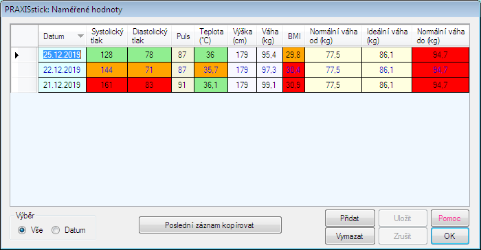 Ve formuláři se nachází tabulka se seznamem u pacienta naměřených hodnot (krevní tlak, puls, teplota, váha, ...).
