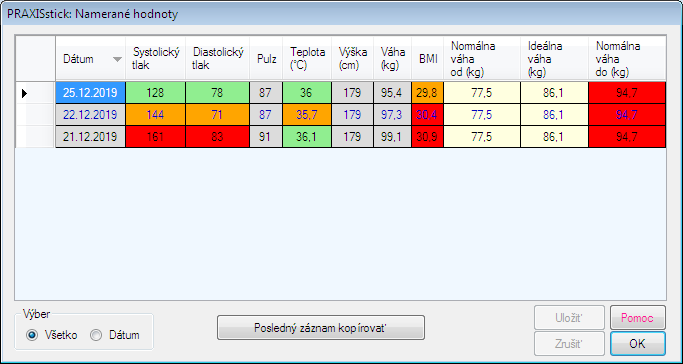 Vo formulári sa nachádza tabuľka so zoznamom u pacienta nameraných hodnôt (krvný tlak, pulz, teplota, váha, ...).
