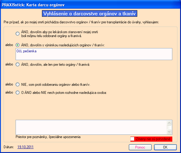 Obrázok ukazuje príklad, v ktorom sú zadané orgány, ktoré sa nemôžu použiť pre darcovstvo orgánov.