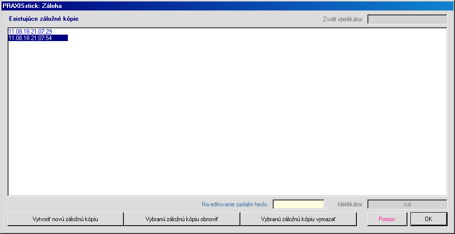Formulár obsahuje listinu so zoznamom záložných kópií - uložených pod identifikátorom uvedeným vpravo dole.