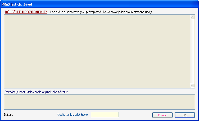 Dáta môze editovať len pacient. Aby sa dal formulár editovať, je treba najprv zadať správne heslo v dolnom poli (a ukončiť zadávanie klávesom tabulátor). Tým sa povolí dosah na zadanie textu do poľa závetu a poznámky.