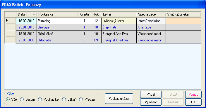 Příklad: Pokud je vybraný řádek (označeno malou šipkou v levém sloupci), tak se kliknutím na tlačítku Poukaz ke ukáží jen řádky s poukázkami, které byly vystaveny pro tutéž specializaci.